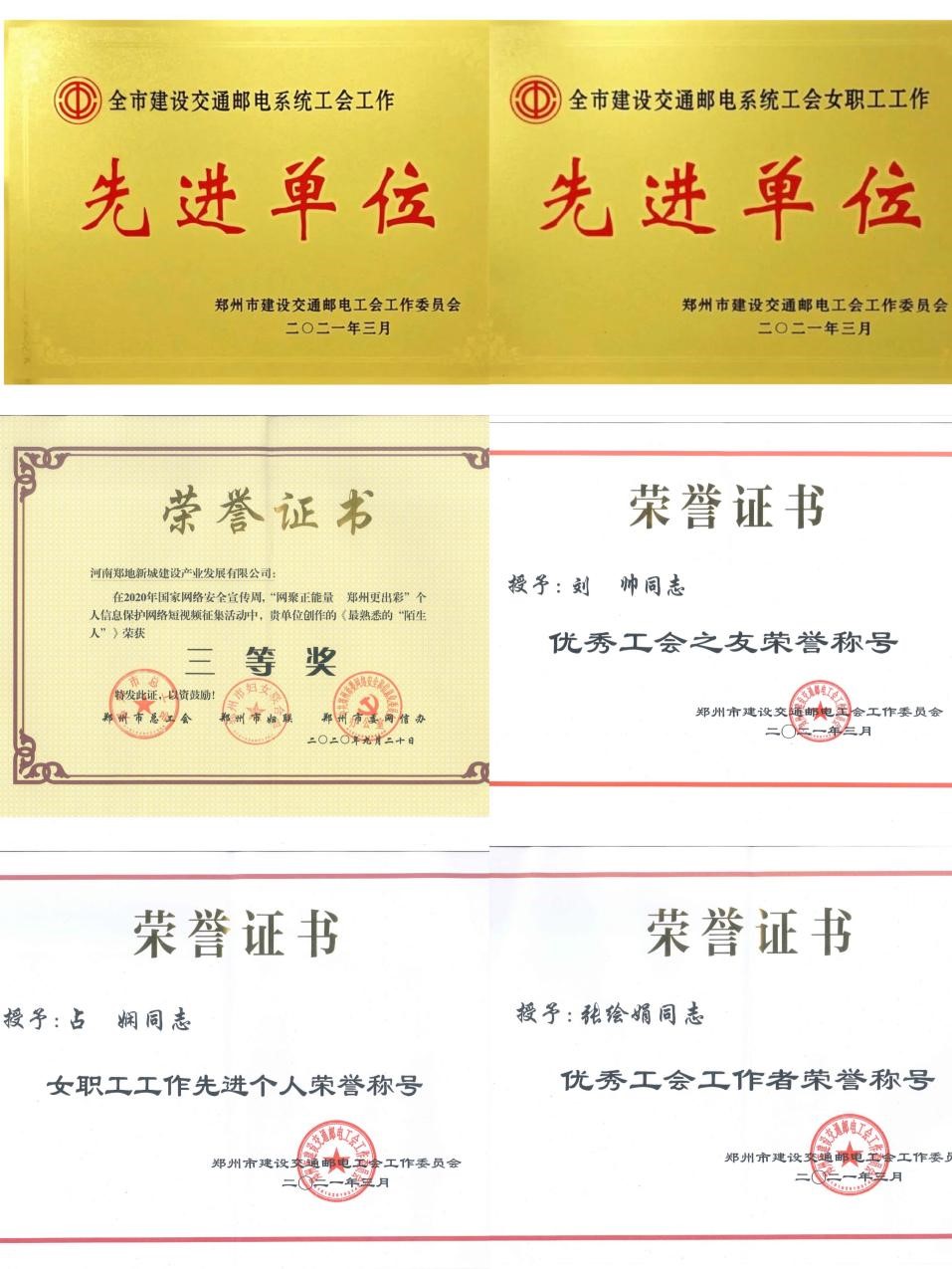 2021年3月22日,經鄭州市建設交通郵電工會工作委員會研究決定,授予我公司工會鄭州市建設交通郵電系統“2020年度工會工作先進單位”和“2020年度女職工工作先進單位”榮譽稱號,并授予劉帥同志鄭州市建設交通郵電系統“2020年度工會之友”榮譽稱號,新城公司工會的占嫻和張繪娟兩位同志分別被評選為“優秀工會女職工工作”和“優秀工會工作者”先進個人。