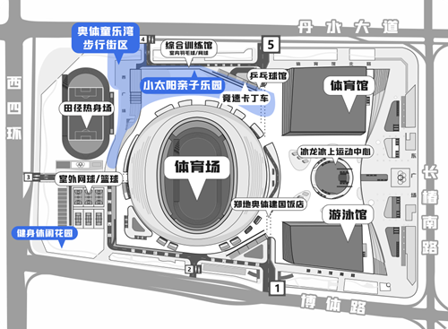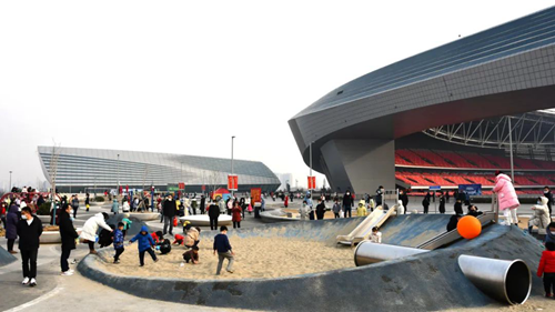奧體童樂灣步行街區西鄰田徑訓練場,適合開展足球、慢跑、飛盤等親子運動,南側配備有“奧體便民共享便利店”和衛生間,向東可直達體育場二層平臺的“小太陽”網紅打卡地,不僅視野開闊,能一覽各場館建筑風貌,還配備了攀爬架、沙坑、秋千等兒童玩樂項目。