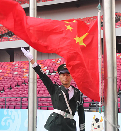 伴隨著慷慨激昂的義勇軍進行曲,五星紅旗冉冉升起,鄭州奧體中心全體員工莊嚴的向國旗行注目禮,以最崇高的方式表達對祖國母親的敬愛之情。