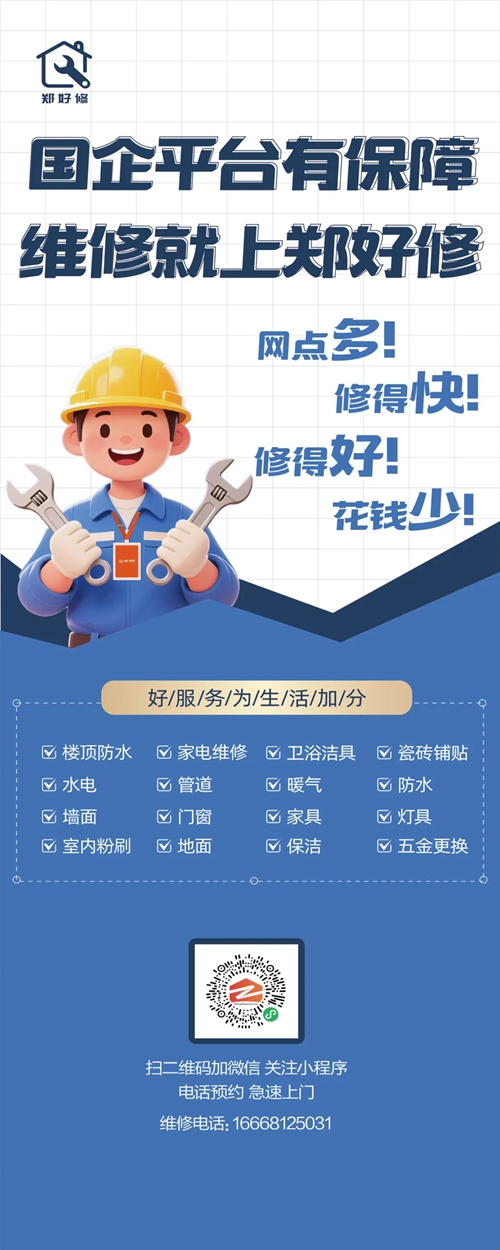 “鄭好修”平臺的市場化拓展路徑清晰明確。平臺將圍繞水電安裝維修、管道疏通、防水補漏、門窗安裝維修4大類11大項410小項開展業務,未來將逐步拓展家用電器售后維修服務領域,形成“政府主導,市場化運作”的綜合維修服務模式。