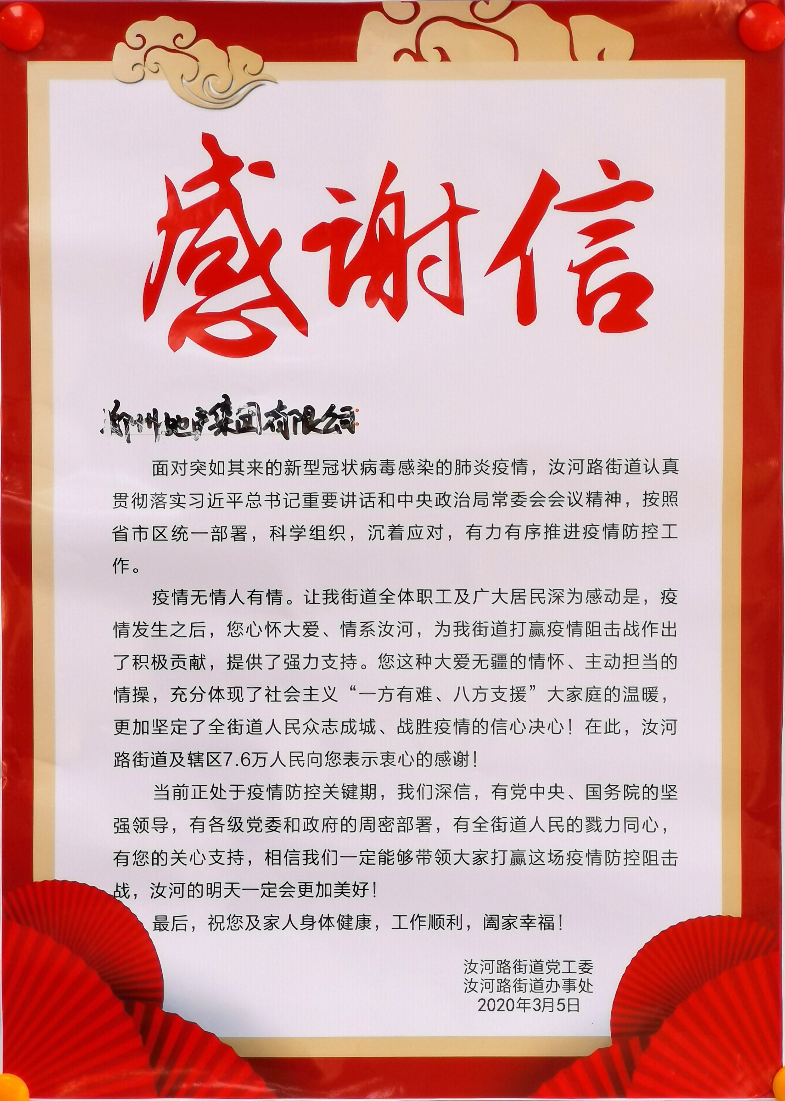 桐淮社區書記王輝代表社區工作人員和志愿者向集團領導送上《感謝信》,并表示集團的慰問讓一線工作人員心里充滿了溫暖,也進一步堅定了開展疫情防控的信心和決心。在地產集團等社會各界的關心關注下,在無數雷鋒式志愿者的共同努力下,我們一定會打贏新冠肺炎疫情防控這場硬仗。