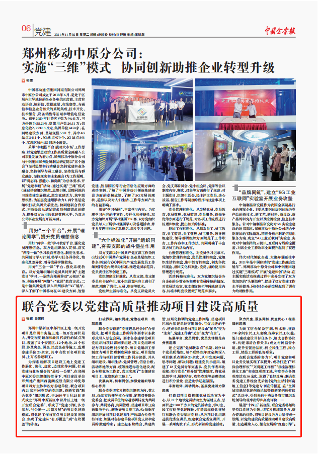 西流湖公司始終堅持“抓好黨建就是最大的政績”,創(chuàng)新“黨建進總包合同”合作模式,貫徹落實“支部建在項目上,黨旗飄在工地上”的工作思路,以中原新區(qū)中部片區(qū)土地一級開發(fā)聯(lián)合黨委和項目黨支部建設(shè)為抓手,以“12343”黨建工作體系為指引,讓黨的主張、黨的作風(fēng)、黨組織的力量在項目建設(shè)中處處彰顯,充分激發(fā)黨員的先鋒模范作用和黨組織的堅強堡壘作用,將黨建轉(zhuǎn)化為生產(chǎn)力,真正實現(xiàn)黨建促發(fā)展的“紅色引擎”作用。公司黨建工作先進經(jīng)驗榮登《中國企業(yè)報》,意味著公司黨建工作先進經(jīng)驗對于全國企業(yè)黨建具有良好的借鑒意義,標(biāo)志著公司黨建工作及宣傳水平再上新臺階。