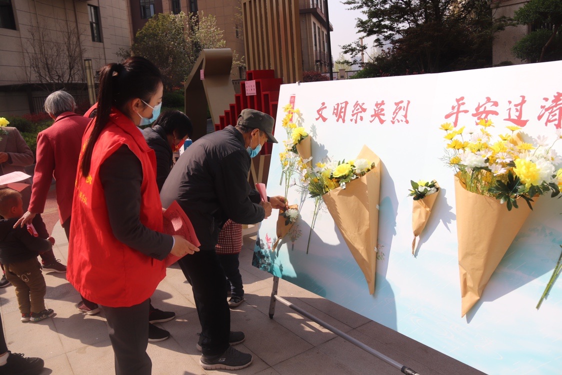 入口處的英烈追思展板吸引了居民們的注意,展板上牛皮紙制作的花束中已經放入了不少黃色或白色的小菊花。支部黨員志愿者魯照宇向居民們介紹:“由于疫情原因,不建議集聚在烈士陵園祭祀,我們倡導文明祭祀、綠色祭祀,希望以這種特殊的方式祭奠革命先烈,營造良好社會風尚。”居民們拿過一支支小菊花親手粘貼在追思展板上表達對英烈的敬意,并寫下追憶英雄烈士的留言。